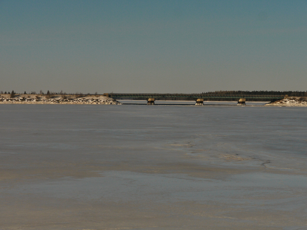 Description: A view from water level of the bridge on the Ferry Road, which connects Wallace and North Wallace. The sun glistening off the ice. Photo courtesy of Paul Bloxsome.
